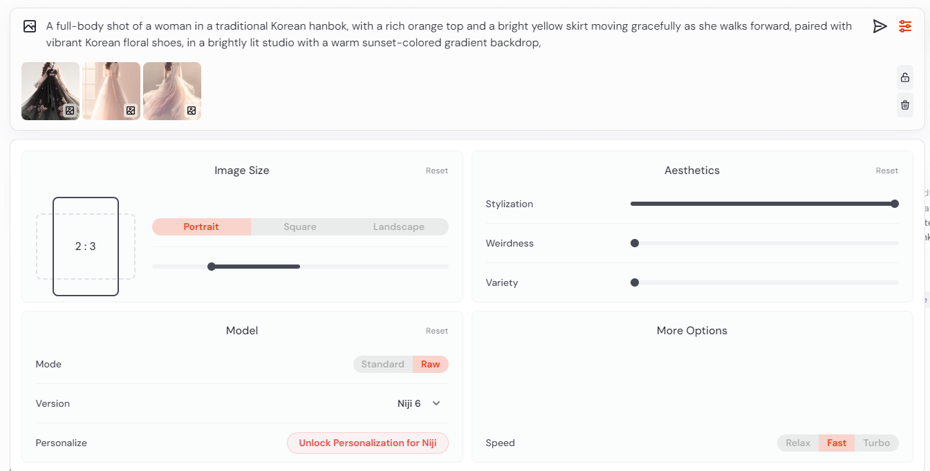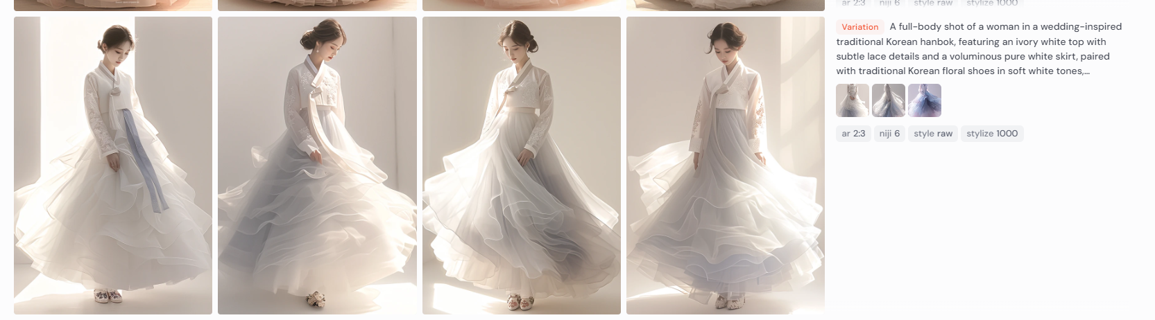 - Niji 모드의 활용: 여전히 niji 버전에서 제가 원하는 디테일이 가장 잘 표현되었어요. 특히 웨딩 한복의 부드러운 색감과 우아한 실루엣이 자연스럽게 나타났답니다.
